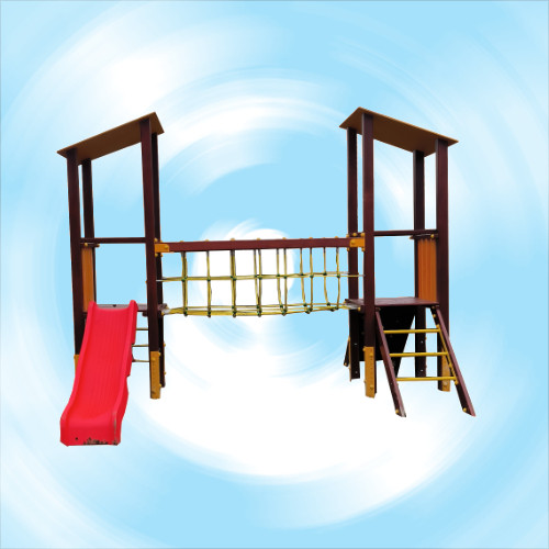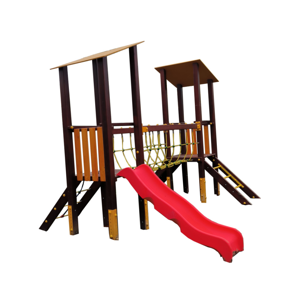 Rétegragasztott lucfenyő; acél lábak és létrafokok; műanyag csúszdapálya és tető; acélbetétes kötél;