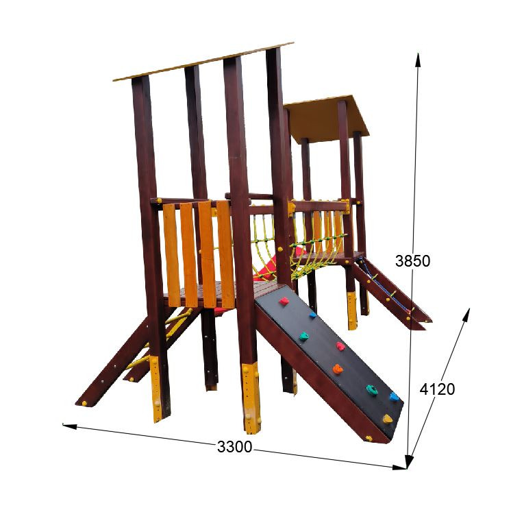 Ez a Panda vár 4120 × 3300 mm alapterületű, 3050 mm magas, és ideális 1-14 éves gyermekek számára. A rétegragasztott lucfenyőből készült szerkezet acél lábakon és létrafokokon áll, műanyag csúszdapályával és tetővel, valamint acélbetétes kötéllel.